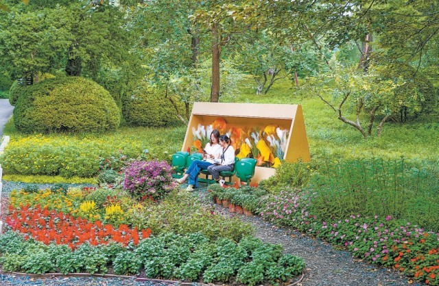 在北京動物園西北部直筒河北岸有一組“萬生之緣”花境,花境設置5個主題觀賞點,分別以植物組團的形態語言演繹“谷麥”“桑蠶”“蔬菜”“果木”“花卉”主題。植物高低錯落,四季接踵而來,實現“人步入畫、畫隨人動”。一組綠色的九三閱兵觀禮座椅添置其中,上搭遮陽傘,地面彩繪“彩蝶之舞”,一經亮相,就成了“最美打卡地”。