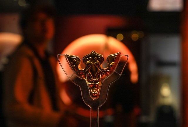 圖為首次進京展出的鳳鳥紋龍首金花飾。