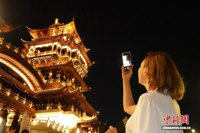 9月26日晚,浙江義烏雞鳴閣在燈光映襯下流光溢彩,成為中外游客夜游義烏的熱門景點。圖為外籍游客在雞鳴閣前拍照記錄。中新社記者 劉子琳 攝