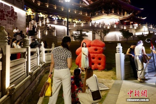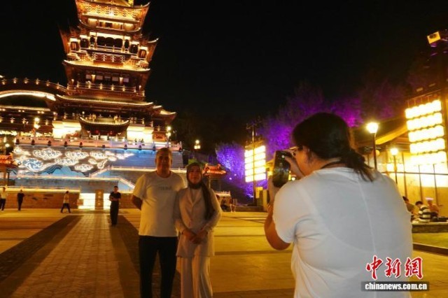 9月26日晚,浙江義烏雞鳴閣在燈光映襯下流光溢彩,成為中外游客夜游義烏的熱門景點。圖為外籍游客在雞鳴閣前自拍。中新社記者 劉子琳 攝