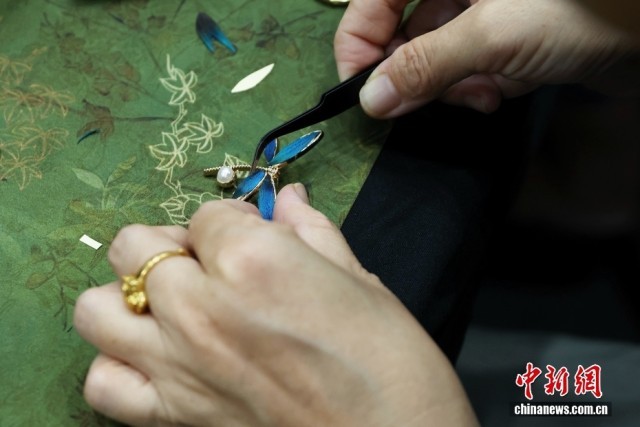 9月29日,北京,2025年圓明園金秋游開幕。金秋游期間,美麗的秋景與豐富多彩的文化活動,將讓游客在秋游的同時感受圓明園深厚的文化底蘊。圖為參與者體驗金秋拾翠(非遺點翠)。