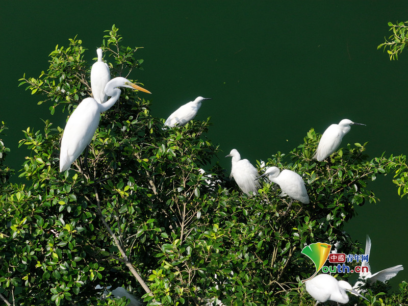 10月8日,廣西賀州,白鷺在昭平桂江國家濕地公園江邊的樹林小憩。寒露時節,正值候鳥遷徙季,數千只白鷺飛抵廣西昭平桂江國家濕地公園棲息,成群結對的白鷺在江邊竹林、小溪和濕地覓食飛舞,構成一幅靈動美麗的自然生態畫卷。