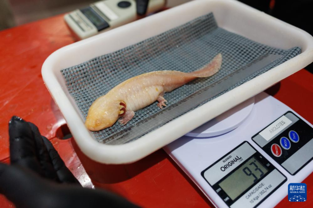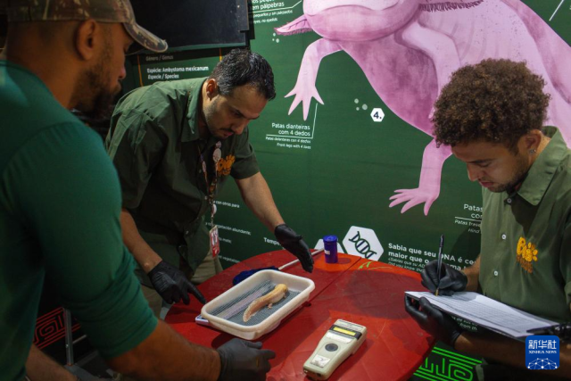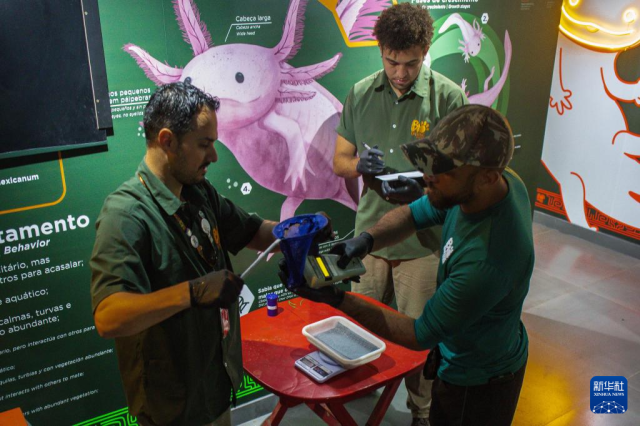 10月8日,在巴西里約熱內盧生物公園,技術人員為鈍口螈稱重和測量體長。