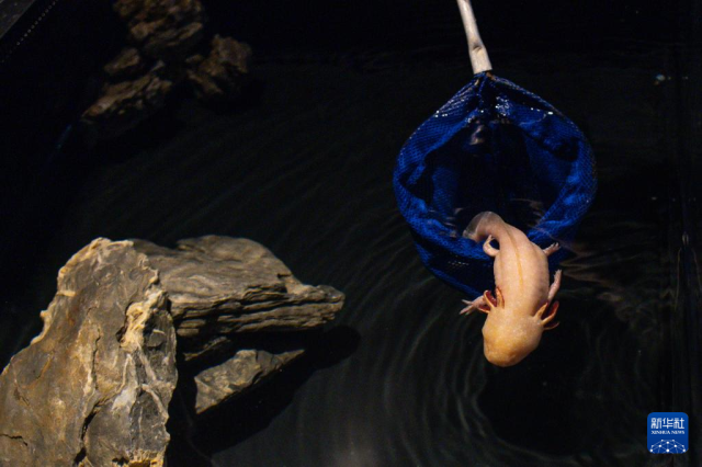 10月8日,在巴西里約熱內盧生物公園,鈍口螈在新展區水族箱中進食特制飼料。