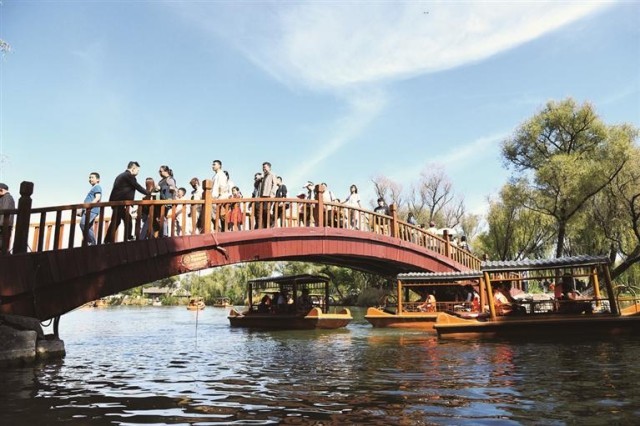 “早聽說‘這么近,那么美,周末到河北’,這次來到河北,首站打卡承德避暑山莊。這里環境美、空氣好,適合帶老人小孩游玩,坐船逛景點既不累又有新鮮感?!眮碜员本┑挠慰屠顣粤照f,自己還在春好軒手工非遺體驗區嘗試了傳統手工技藝,老師手把手教學,從選料、裁剪到拼接都講得特別細致,自己做的手工藝品特別有紀念意義,回去要好好收藏。