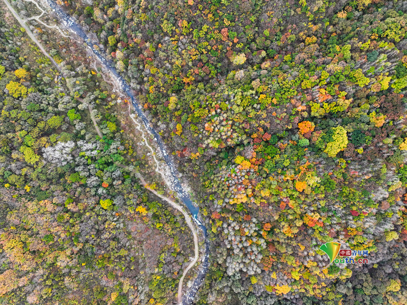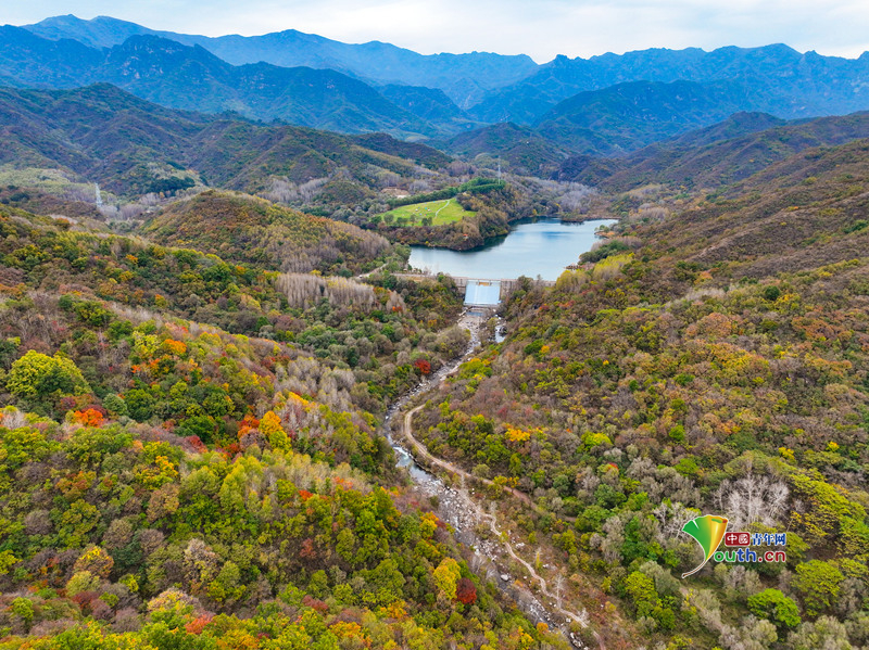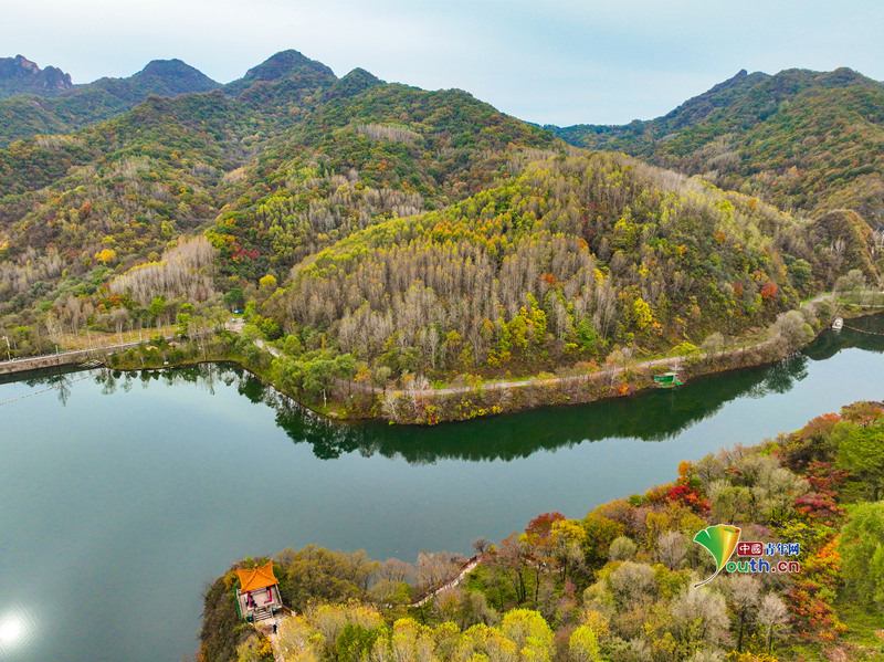10月12日,北京延慶區玉渡山景區進入到秋景彩葉最佳觀賞期,山林間五彩樹葉絢爛艷麗,航拍視角下的山水風光美如油畫。