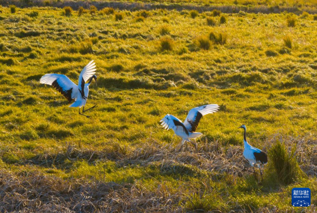 10月9日,在黑龍江撓力河國家級自然保護區,丹頂鶴在濕地中活動(無人機照片)。