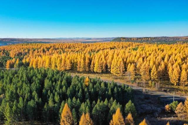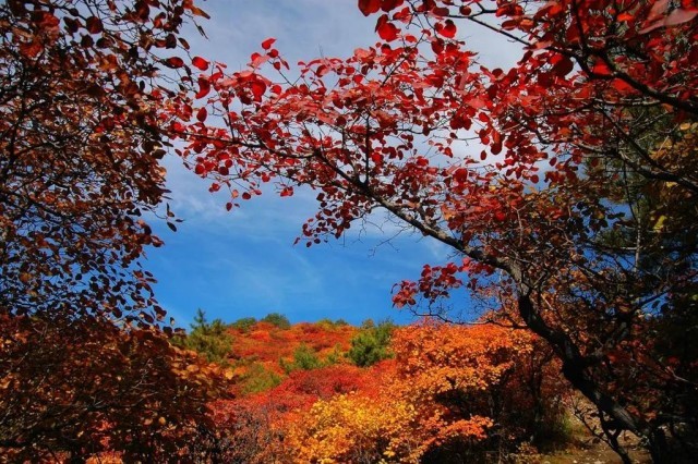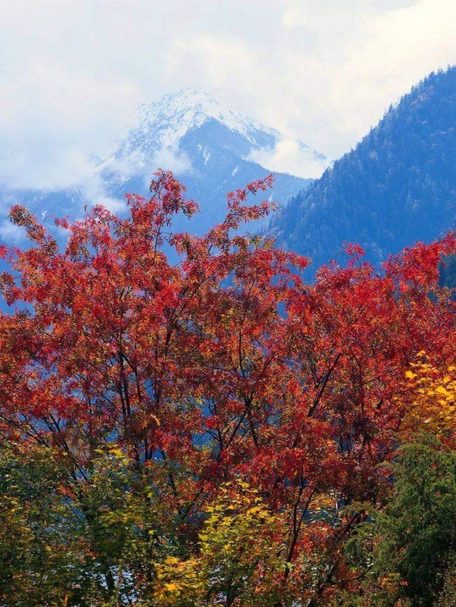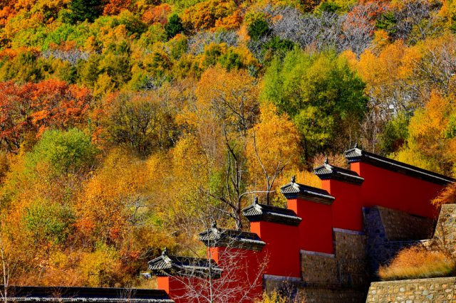 漫山紅葉與金黃的樺樹、翠綠的松柏交織
