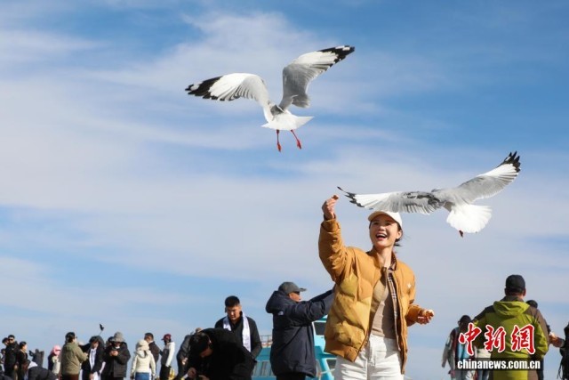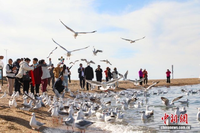 10月22日,青海省海南藏族自治州共和縣青海湖畔,游客與水鳥互動。深秋十月,青海湖畔草地泛起金黃,羊群在草地上悠然自在。碧藍的湖面上,水鳥翩躚,與游客親密互動,構成一幅人與自然和諧共生的柔美畫卷。
