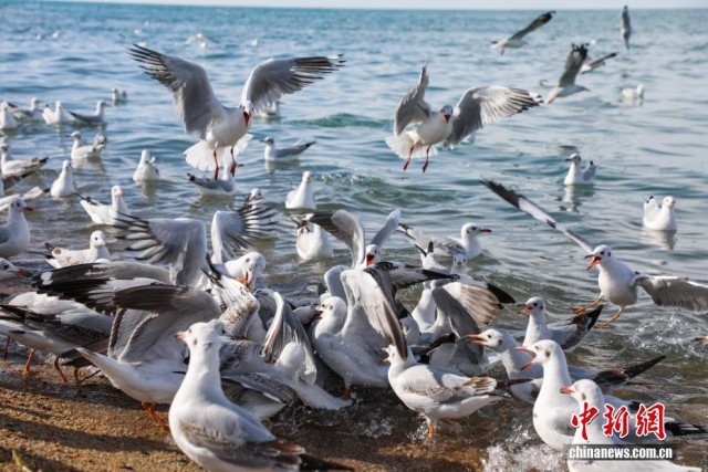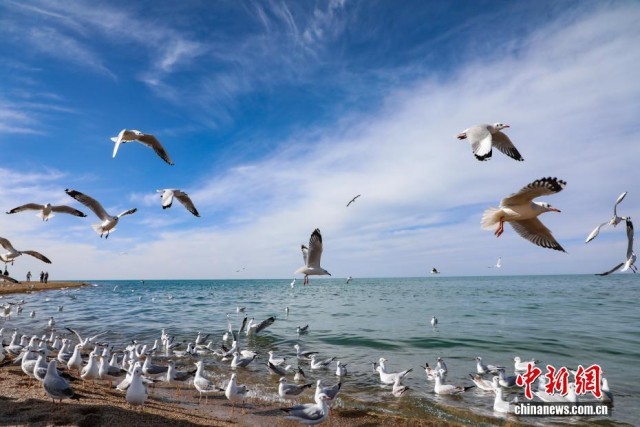 10月22日,青海省海南藏族自治州共和縣青海湖畔,水鳥振翅飛翔。深秋十月,青海湖畔草地泛起金黃,羊群在草地上悠然自在。碧藍的湖面上,水鳥翩躚,與游客親密互動,構成一幅人與自然和諧共生的柔美畫卷。