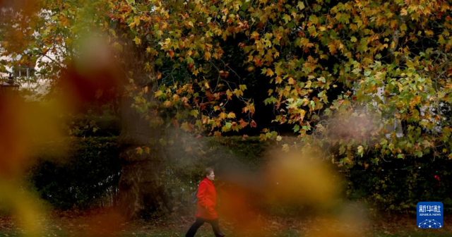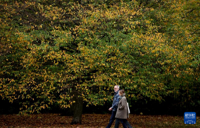 10月27日,一名女子手推嬰兒車走在英國倫敦攝政公園。