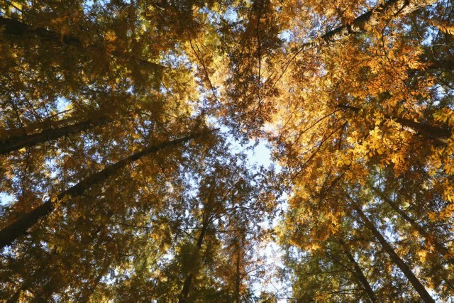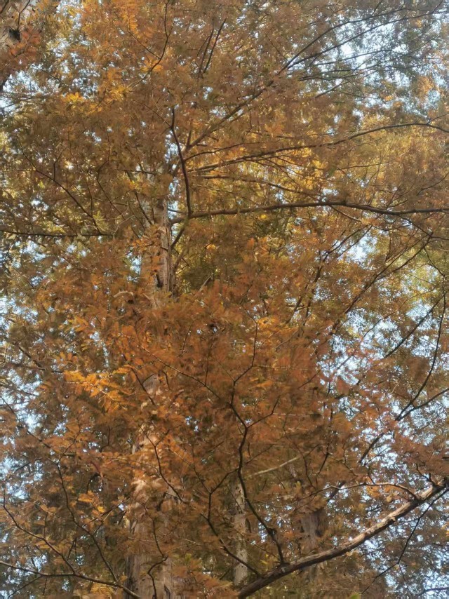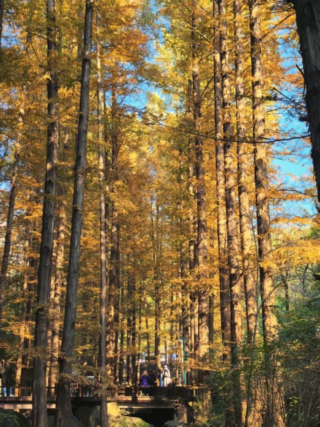 作為華北地區面積最大的水杉人工林之一,櫻桃溝的水杉林不僅是秋日美景擔當,更是重要的植物科普活課堂。水杉是國家一級重點保護野生植物,屬于第四紀冰川遺留下來的 “活化石” 物種,其樹干通直挺拔,最高可達 40 余米,線形的葉片呈羽狀排列,入秋后因溫度降低,葉綠素分解,類胡蘿卜素等色素顯現,造就了層次豐富的色彩變化。漫步林間,腳下是松軟的落葉層,耳畔是鳥鳴與溪流聲,抬頭可見陽光透過枝葉形成的丁達爾效應,橙紅色的水杉與清澈的櫻桃溝溪流相映成趣,構成一幅動靜結合的秋日生態畫卷。