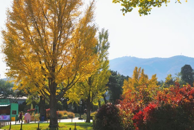 在絢秋苑內,白蠟、銀杏、欒樹、元寶槭等交相輝映,在陽光的映照下,散發出熠熠光輝。這些高大喬木將人們環抱于溫暖的秋色之中,置身于此,身心豁然開朗,仿佛步入遠離塵囂的世外桃源。櫸樹的葉片在秋風中漸漸轉為褐紅色,與銀杏的金黃形成鮮明對比。人們或駐足拍照,或靜靜凝望,心隨景動、情由境生,無不沉醉于這濃郁的秋意中。