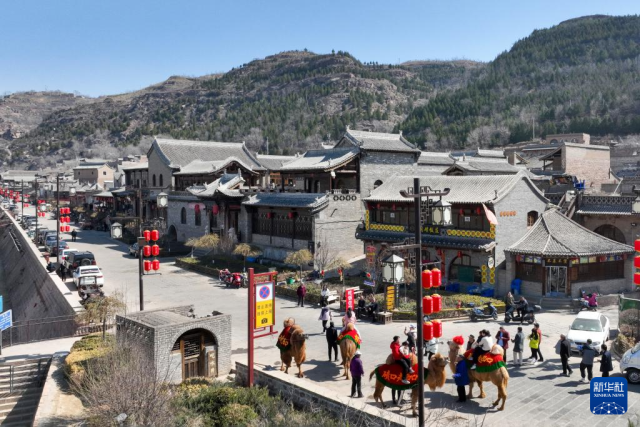 游客在磧口古鎮騎駱駝(3月19日攝,無人機照片)。