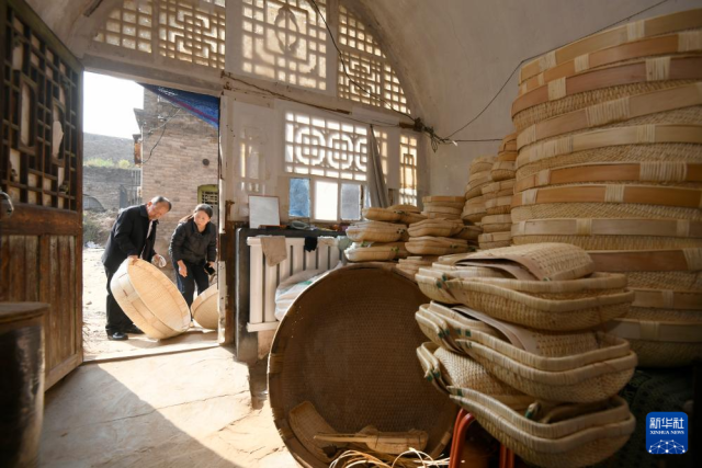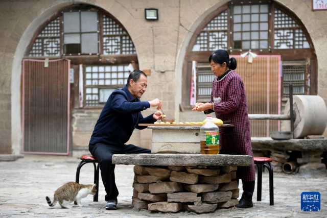 在山西省呂梁市臨縣磧口古鎮,村民在院子里做油糕(10月30日攝)。