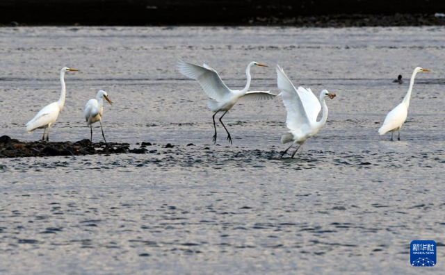 11月4日,在黑龍江省牡丹江市江心島附近的江灘淺流中,白鷺在覓食。