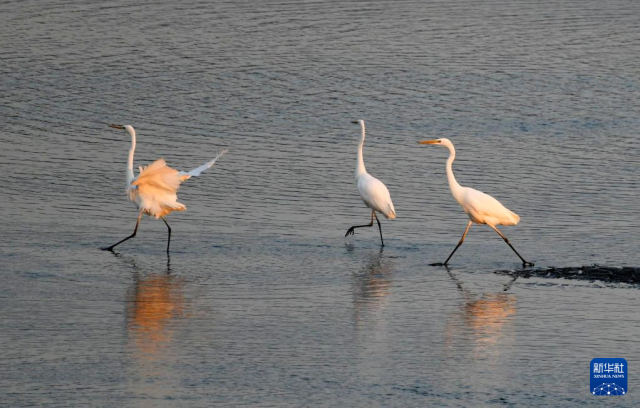 11月3日,在黑龍江省牡丹江市江心島附近的江灘淺流中,白鷺在覓食。